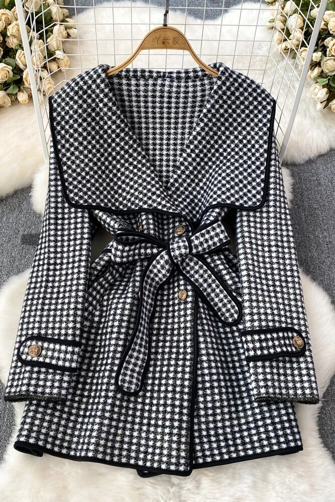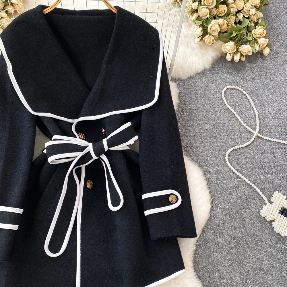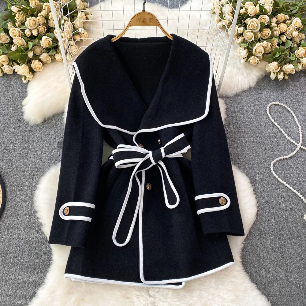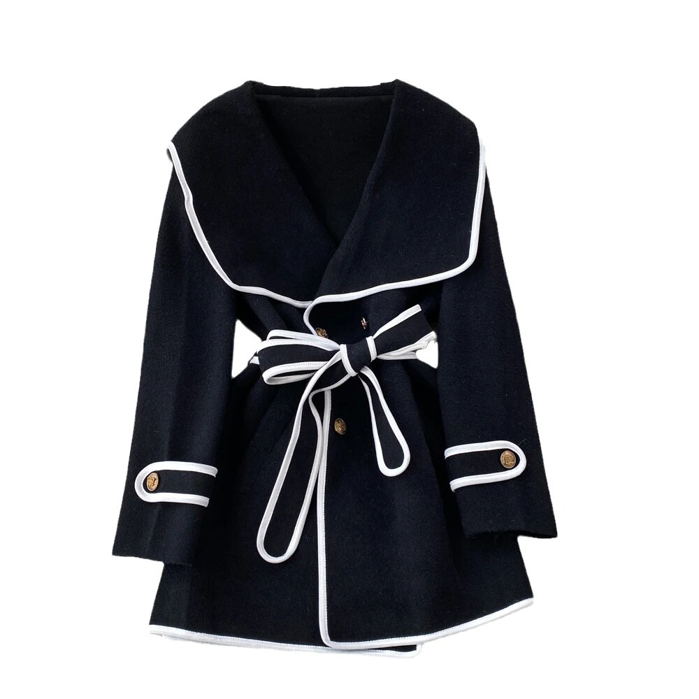 Fashion Navy Collar Loose Waist Woolen Coat Design Jackets for Women