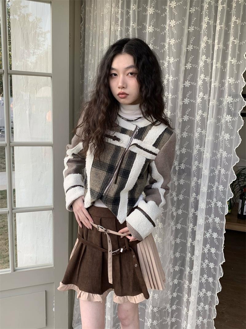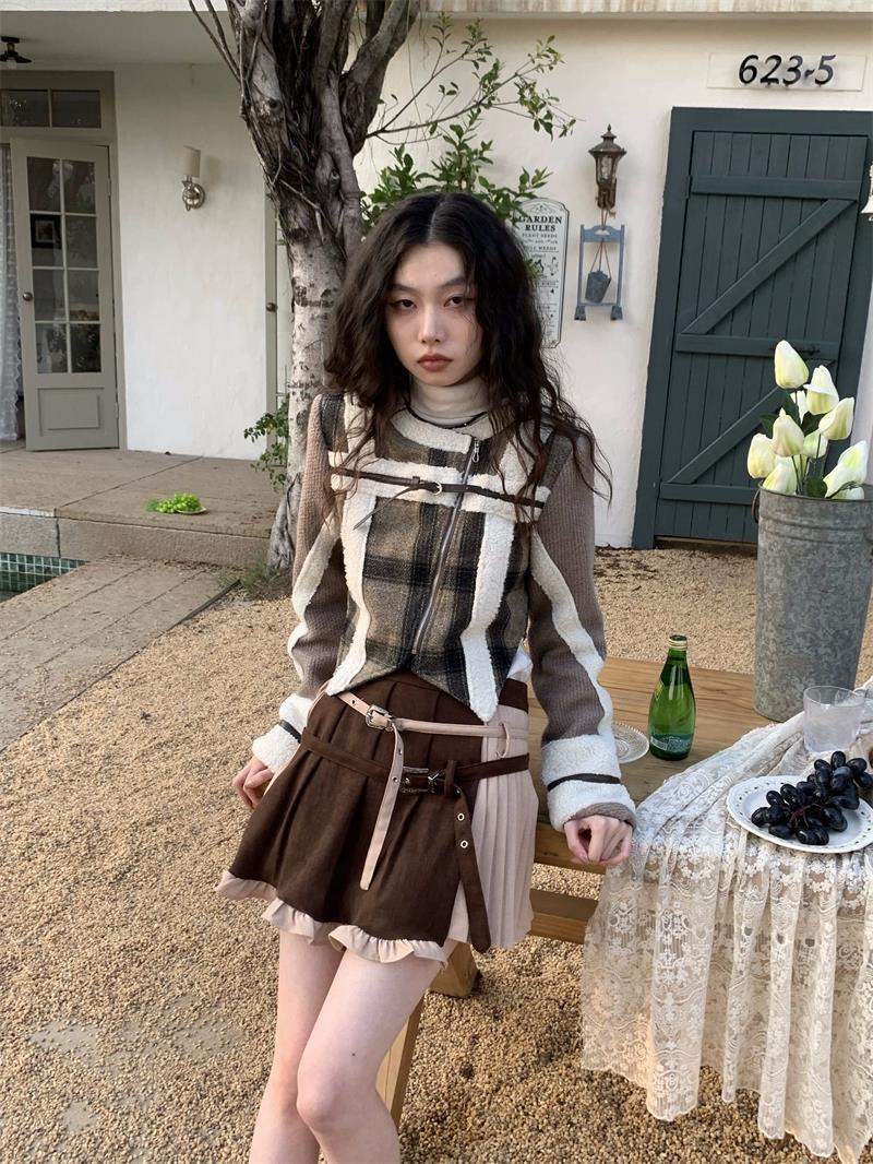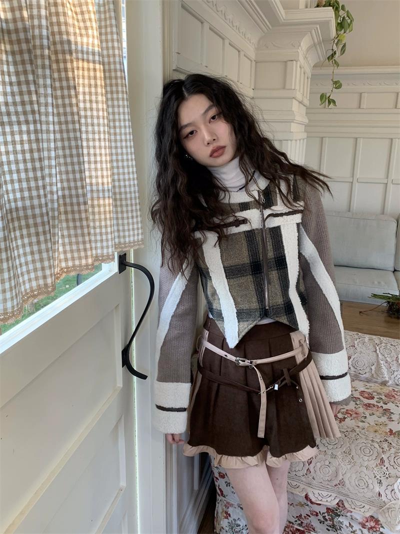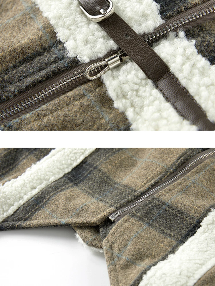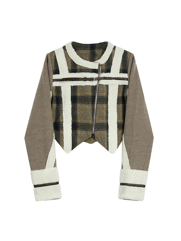 Plaid Spliced Jackets for Women Autumn Winter Vintage New O Neck Wool Coats Chic Zippers Long Sleeve Jackets